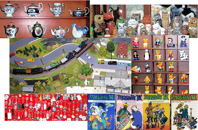 Auf über 200 m² bieten wir zur Zeit 97 verschiedene Sammlungen an von A wie Abzeichen E wie Eisenbahn bis Z wie Zuckerstückchen.